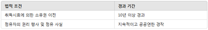 먼저, 소유권의 취득시효에 대해 이해하는 것이 중요합니다. 취득시효란 소유권을 포함한 재산권이 점유와 권리 행사를 통해 일정 기간이 지나면 소유권이 이전되는 법적 제도입니다. 민법 제245조에 따르면, 토지의 소유권을 주장하기 위해서는 10년 이상의 지속적인 점유가 필요합니다.