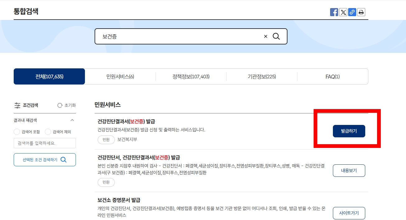 - 상단 검색창에 "건강진단결과서(보건증)" 입력