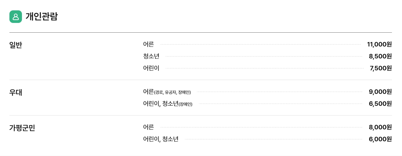 이제까지 다른 곳에서 할인은 받아 보지 못했습니다. 할인 대상은 장애인 또는 가평군민, 경로, 어린이 등으로 신분증이나 어린이는 가족관계 증명서 가지고 가시면 됩니다.