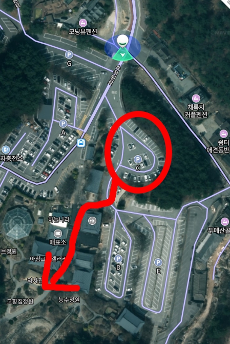 수목원 도착전입구에서 왼쪽 화살표 방향으로 진입하시면 됩니다. 주차 후 화살표 방향을 따라서 이동하시면 입구가 나오게 됩니다.