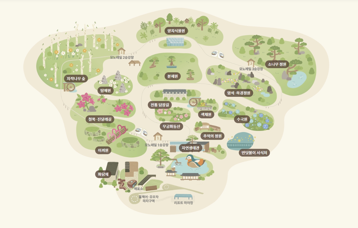 - 단풍나무원 → 하늘정원 → 이끼원 → 반딧불이원