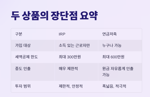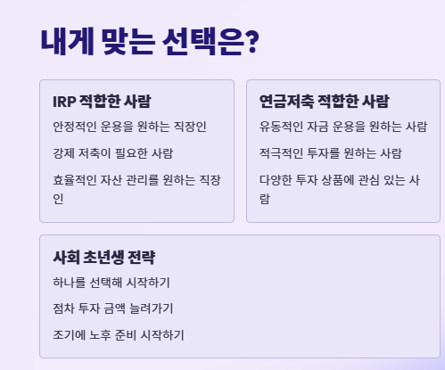 마지막으로, IRP와 연금저축을 고를 때는 자신의 재정 상황과 목표에 맞는 상품을 선택하는 것이 중요해요.