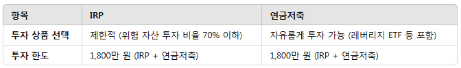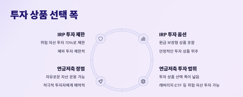 연금저축은 보다 폭넓은 투자 옵션을 제공하며, IRP는 원리금 보장형 상품 위주로 선택할 수 있어요. 각 상품의 투자 가능 범위를 잘 살펴보세요!